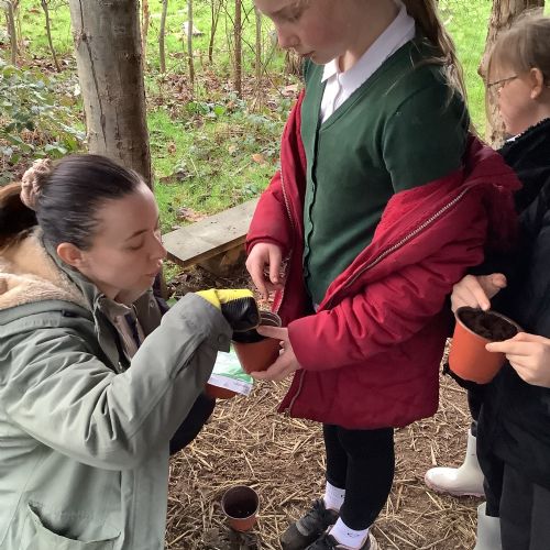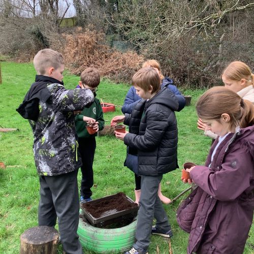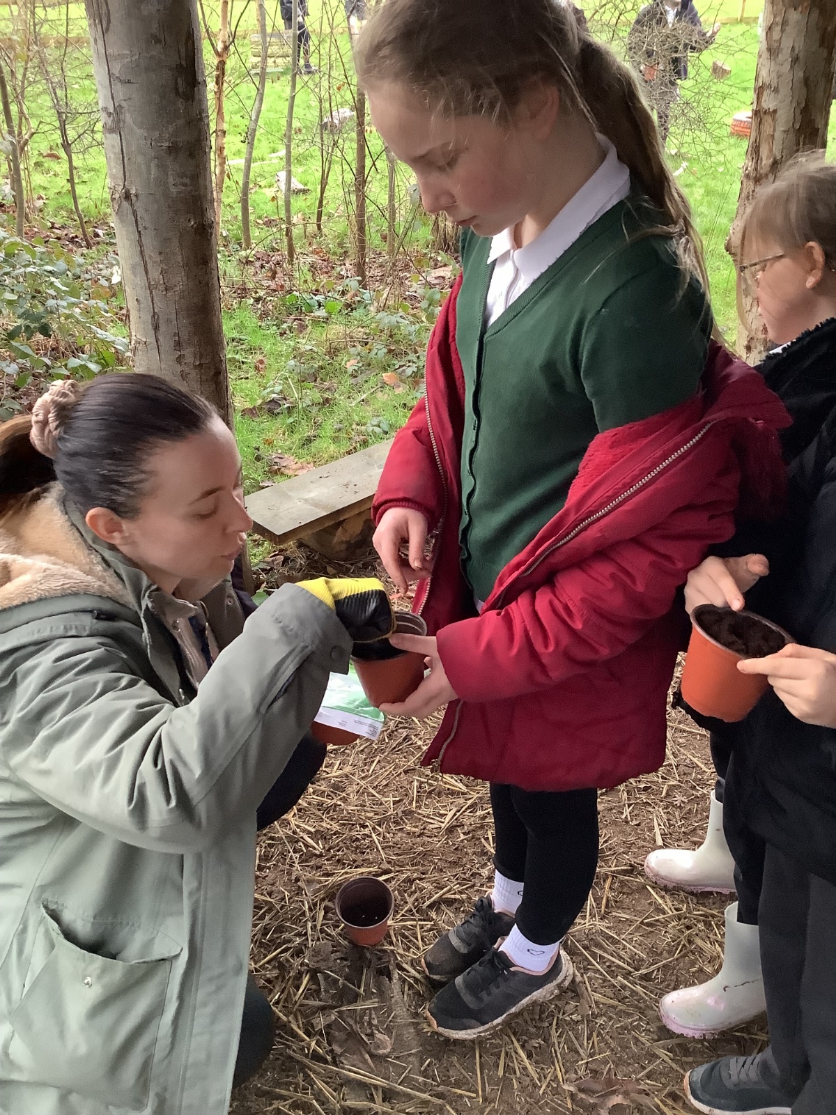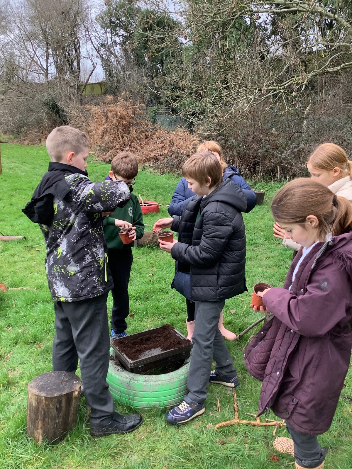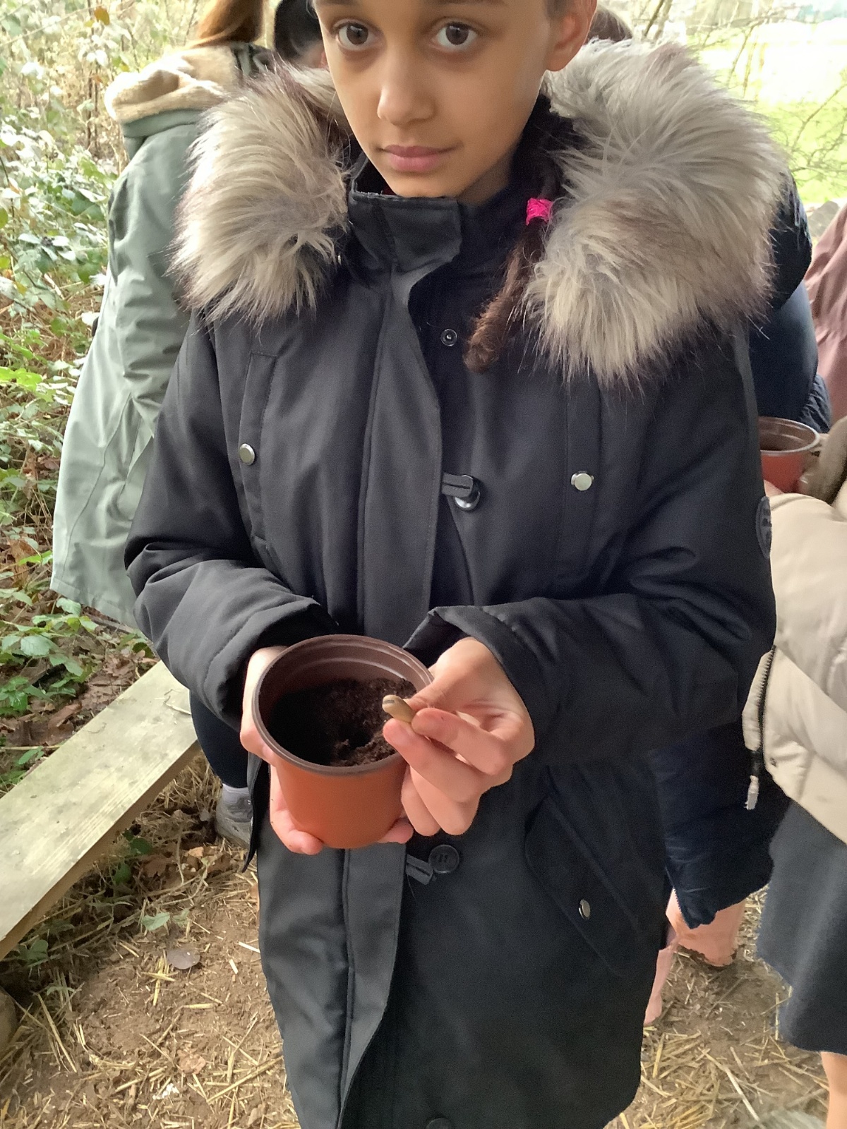 We went to the forest school area to plant some broad beans seeds. Currently, they are in pots in the classroom to germinate and then they will be replanted outside.