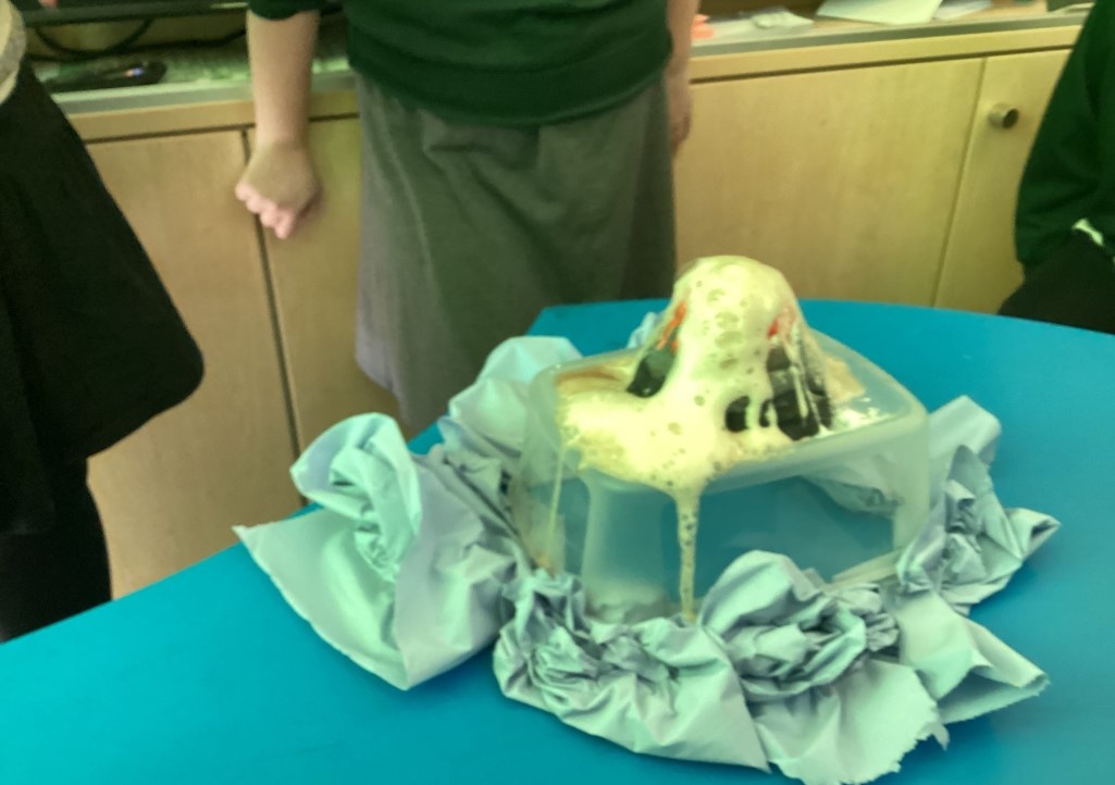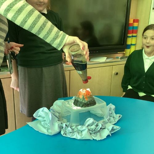 In Year 3 and 4, we have been learning about volcanoes. Eva (Poplar) made a model of a volcano at home with her Mum which she kindly brought in to share. We decided to complete the experiment in class and we poured bicarbonate of soda and vinegar in to make an 'explosion'. Jayden used the language from our Geography lessons to describe the explosion as an 'effusive explosion' meaning that the lava came out slowly and steadily - well done Jayden!