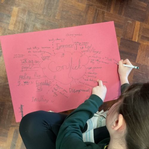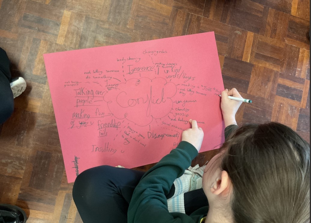 The children learnt to address conflict with 'I am feeling...' rather than blame. The children then put down their thoughts in a mind map with examples of conflict in school and what causes it.