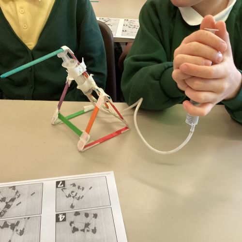 In Year5/6 we have been busy exploring pneumatic systems. We created a working pneumatic system using only 4 pieces of equipment: tubing, syringes, lolly sticks and tape.